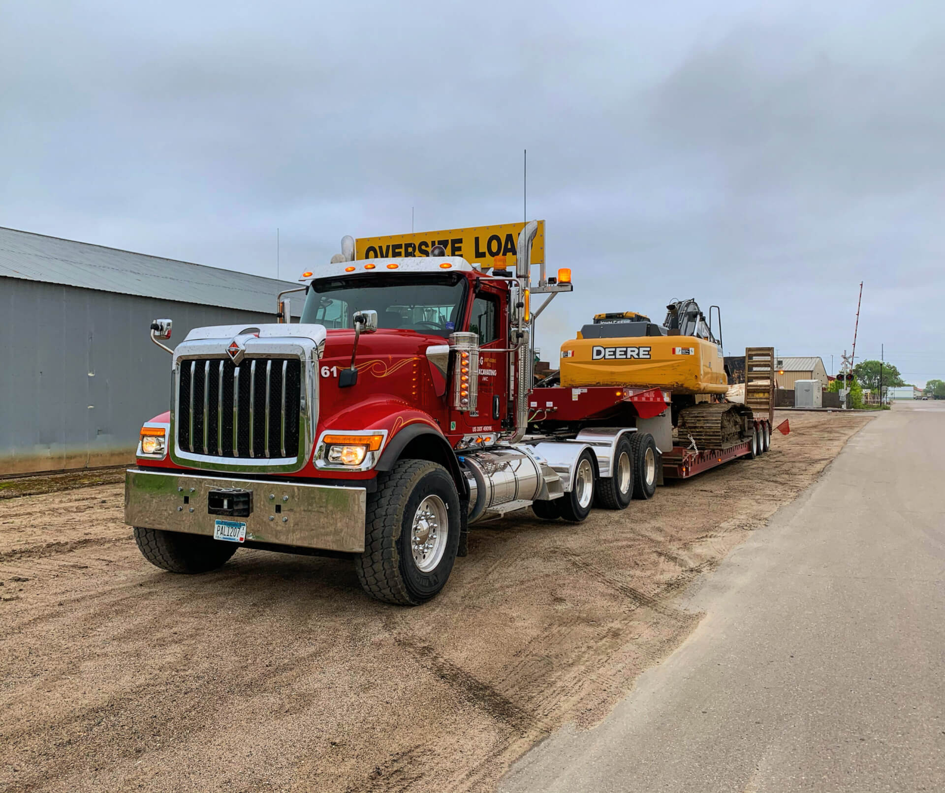 Working in the earthmoving industry requires oversized hauling for a company to be self-sufficient, which D & G Excavating, Inc. has been performing since opening in 1979. Since 2005, D & G has been specializing in custom oversize and overweight hauling for our customers. Fully licensed and insured, D & G can meet your custom hauling needs up to 100,000 pounds. We utilize a fleet of 8 units to fit our customers needs including pickups and 5th wheel trailers, 35 to 55 ton lowboy trailers, and a Landoll winch trailer. You can find our trucks hauling in the 5 state area of Minnesota, Wisconsin, Iowa, North Dakota, and South Dakota. However, we have the ability and experience to serve a broader area as needed. Contact us for a free estimate for your heavy or oversize haul.